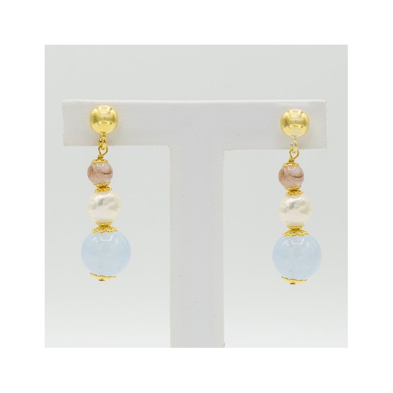 Colorati orecchini con giade dai colori caldi e tenui. Arricchiti da luminose perle. A dare maggior risalto ai colori di questo gioiello ci pensa l'acquamarina, grazie alle sue naturali sfumature.