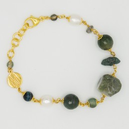 Splendido bracciale composto da tre fili di perle e pietre dure. L'abbinamento tra la labradorite e le perle sono il punto forte di questo gioiello.