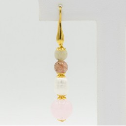 Particolare orecchino con corallo a forma di sassolini, i quali vengono sapientemente, abbinati al chiarore della perla e alle eleganti sfumature dell'agata strawberry.