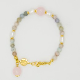 Sontuoso bracciale a quattro fili, composto da splendide perle sferiche arricchito da brillanti pietre di luna e scaglie naturali di agata rosa. L'eleganza di questo gioiello è evidente e palese.