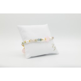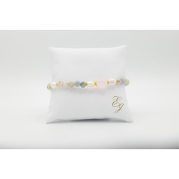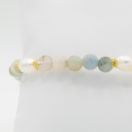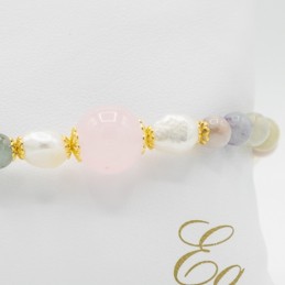 Originale bracciale a tre fili con pietre naturali ( quarzi ) e perle, colorato da piccoli sassi di corallo, i quali donano maggiore qualità e prestigio al gioiello stesso.