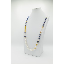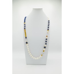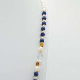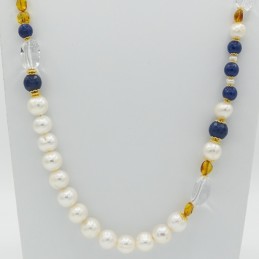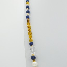 Bella collana con abbinamenti eccezionali. Il giallo elegante dell'ambra si accosta perfettamente al blu del quarzo. A coronare il tutto ci pensa la splendida luce del cristallo di rocca.