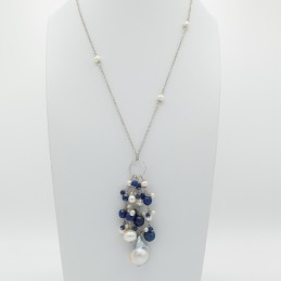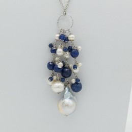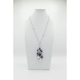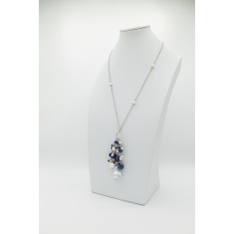 Eccentrica collana con grosso grappolo formato da splendidi quarzi blu abbinati a fantastiche perle. La sfaccettatura dei quarzi regala luce al gioiello stesso.