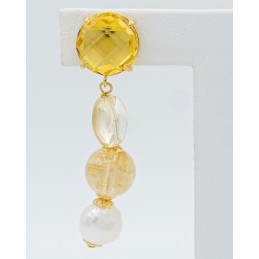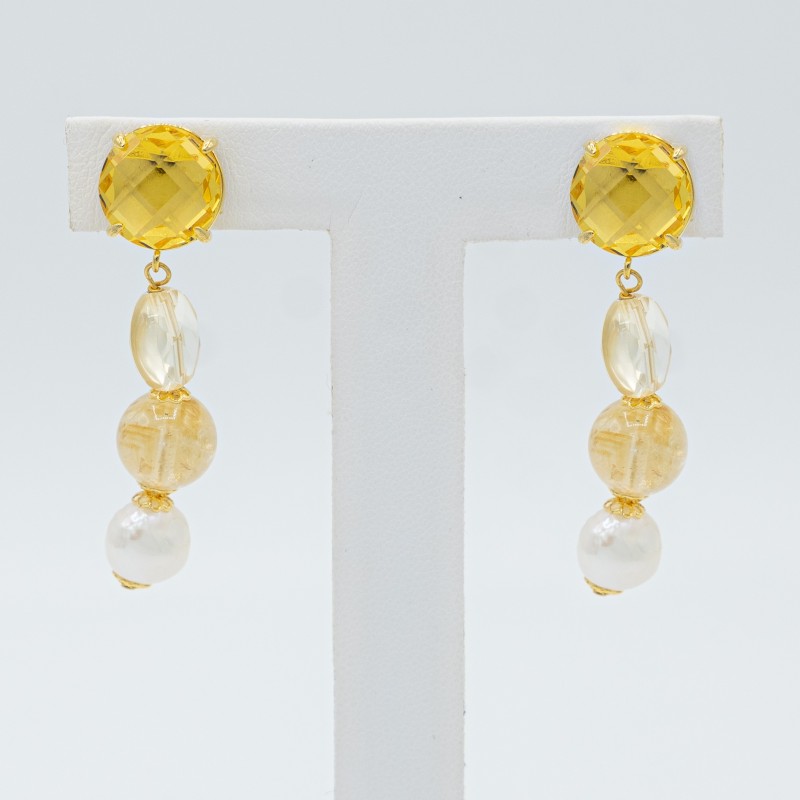 Brillante orecchino pendente con quarzo citrino e perle naturali. Raffinato e luminoso.