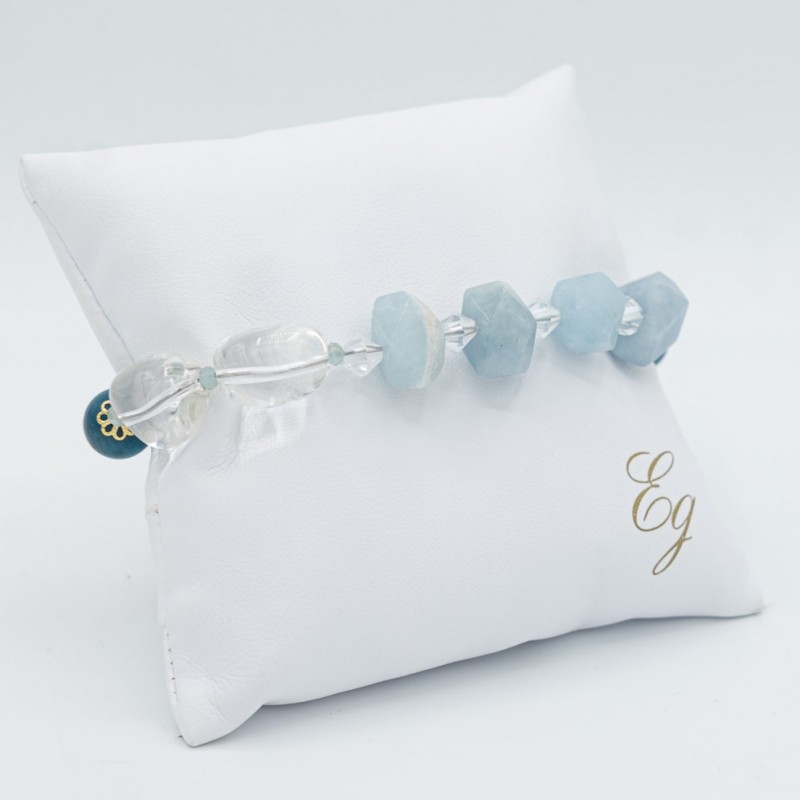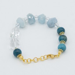 Gioiello colorato e luminoso. La naturale bellezza dei colori dell'acquamarina e delle giade rendono questo bracciale veramente speciale. Alla lucentezza dello stesso ci pensa il cristallo di rocca, grazie alle sua splendida trasparenza.
